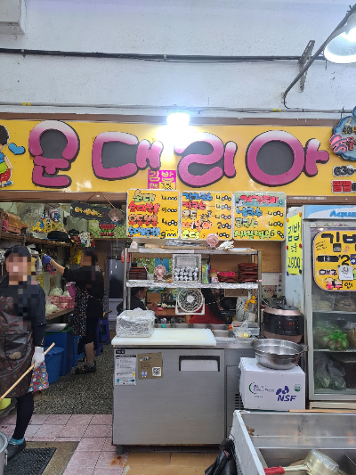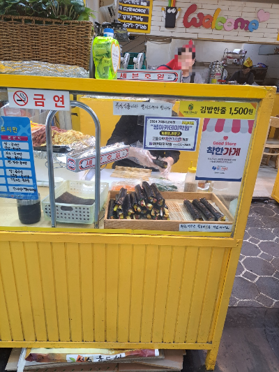 이 김밥집은 거제고현시장의 중앙통로에 위치해 있습니다. 김밥과 떡볶이 등 맛이 좋아 고객들이 줄 서서 기다리고 있네요