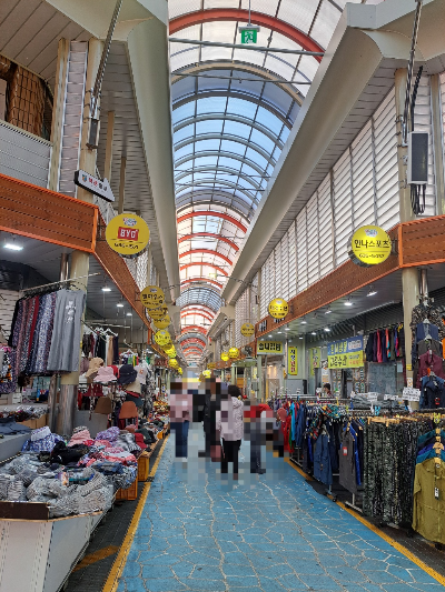 의류, 잡화, 식료품, 건어물 등 다양한 물품을 한 곳에서 구매할 수 있습니다. 시장 내부는 넓고 통로가 잘 정리되어 있어 편리하게 이동할 수 있습니다.