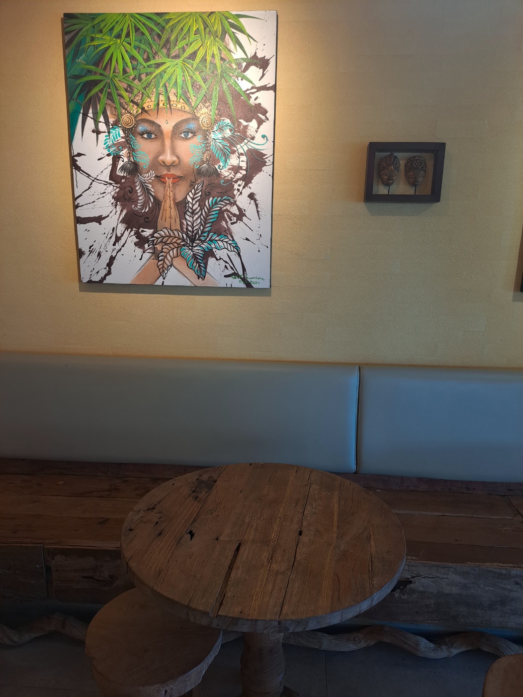 실내 인테리어도 사장님의 남다름이 돋보이는 또 다른 이유예요. 필리핀 화가가 그린 이색적인 그림을 벽면에 장식해 놨어요. 카페 분위기와 잘 어울려요. 그리고 실제 발리에서 가져온 소품들도 제 역할을 톡톡히 해내고 있었어요.