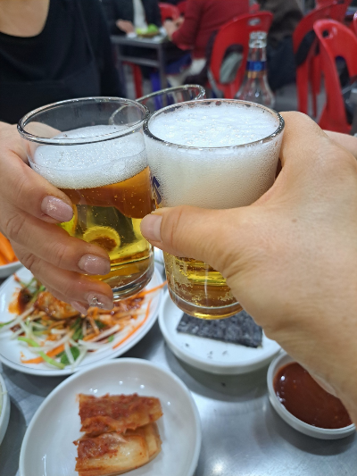 뜨끈뜨끈한 굴구이~~ 굴을 초장에 바로 찍어도 먹고 과메기 먹듯 김이랑 배춧잎이랑 함께 싸서 먹어도 보고~~ 입맛대로 먹었네요. 정말 맛있게 먹었어요. 이 좋은 자리에 맥주까지 거드니 더욱 꿀맛입니다.
