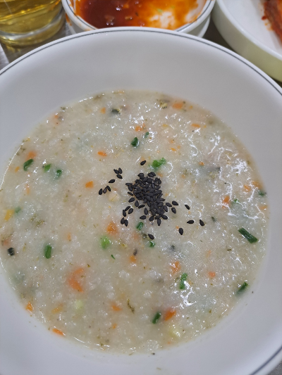 한참 수다를 떨면서 먹고 있으니 마지막 코스 요리 굴죽이 나왔습니다. 야채가 들어간 굴죽~ 부드러운 데다 감칠맛도 나서 더욱 맛있게 먹었습니다.