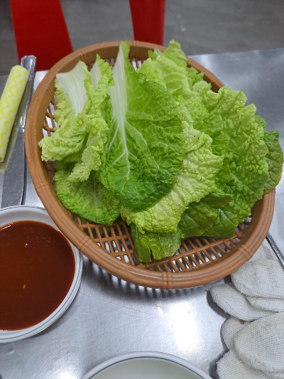 굴이 구워질 때까지 (삶아지는 것 같은) 기다리는 동안 김, 배춧잎 등 다양한 갖가지 반찬과 코스요리 중 두 번째 굴회가 나왔습니다.