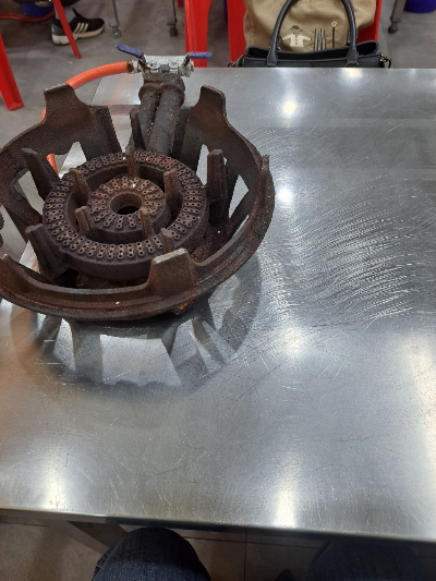 각 테이블 위에는 큰 가스레인지가 놓여있었어요. 코스요리를 주문하자마자 굴구이부터 나왔어요. 직사각형 모양의 큰 용기에 생굴이 가득~ 불을 켜고 기다리면 끝~ 나이프와 목장갑을 같이 줬습니다. 나중에 굴이 다 구워지면 뜨거우니 조심해서 먹으라는 뜻이겠죠