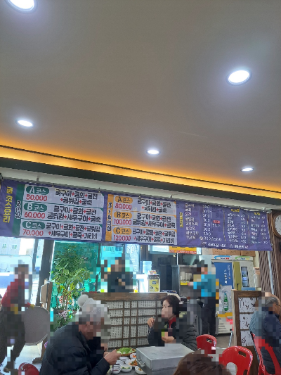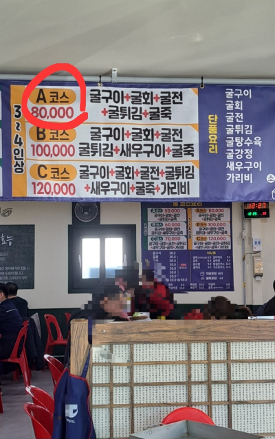 우리는 3~4인용 A코스 요리를 주문했습니다. A코스 요리에는 굴구이+굴회+굴전+굴튀김+굴죽으로 구성되어 있었어요.