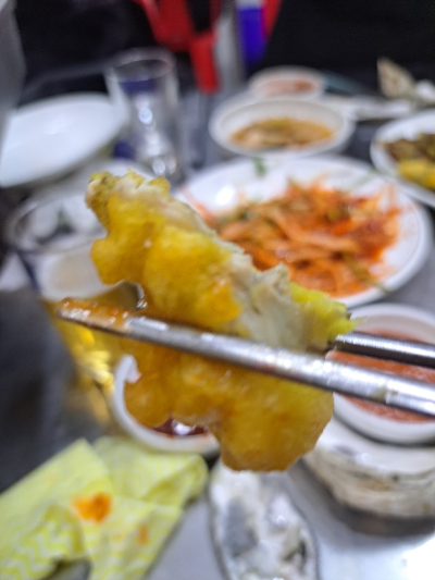 굴구이랑 굴회, 굴전 먹느라 정신없는데 굴튀김까지~ 굴튀김에는 머스터드 소스까지 나왔어요. 너무 맛있게 많이 먹은 탓일까요. 굴튀김까지 먹으려니 배가 걱정이 되었어요. 그래서 그동안 못 나눴던 수다를 한참 떨었네요. 맛있게 먹으면서 보니 정말 겨울별미 굴구이를 드시러 오는 손님들이 많았어요.
