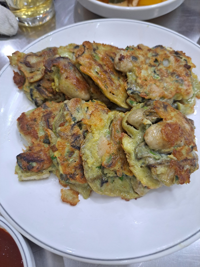 굴회랑 조금씩 먹고 있으니 굴전이 나왔어요. 큼직한 굴로 만든 굴전~