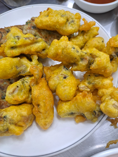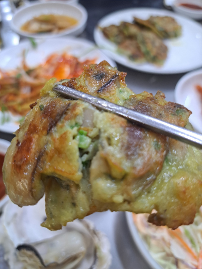 굴회랑 조금씩 먹고 있으니 굴전이 나왔어요. 큼직한 굴로 만든 굴전~