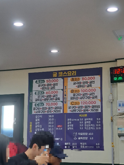 우리는 3~4인용 A코스 요리를 주문했습니다. A코스 요리에는 굴구이+굴회+굴전+굴튀김+굴죽으로 구성되어 있었어요.