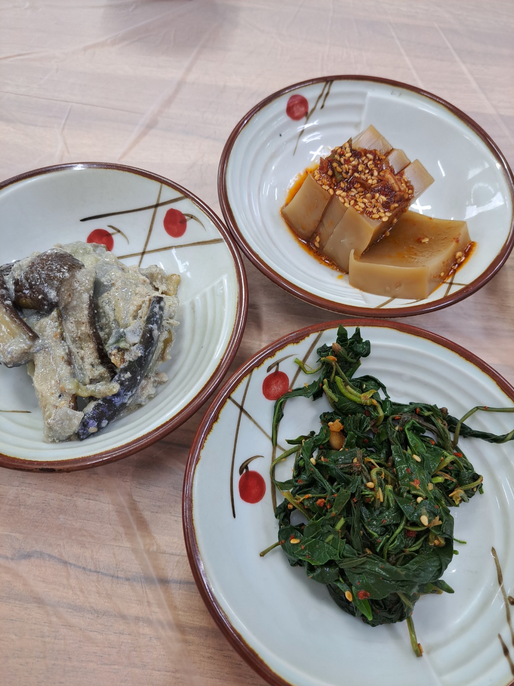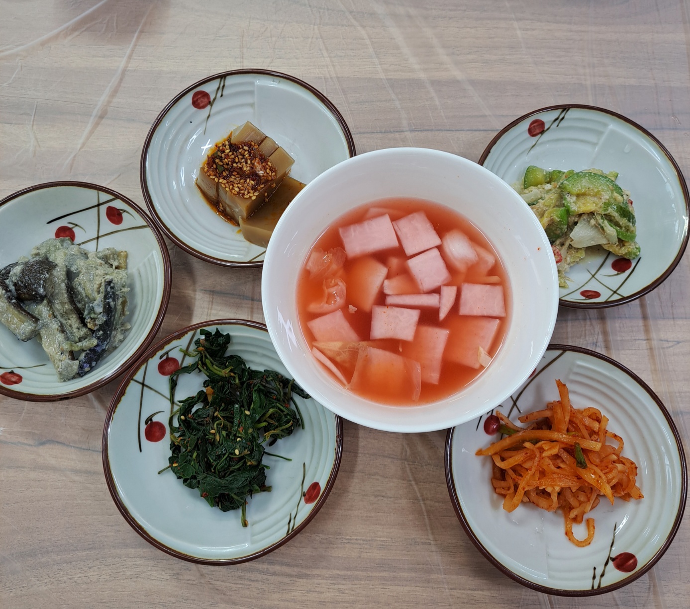 가지나물, 고춧잎무침, 도토리묵 무침, 애호박나물, 무채김치, 예쁜 양배추 물김치~