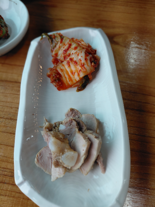 한 상차림에는 갓담은 김치와 수육까지 나왔습니다.
