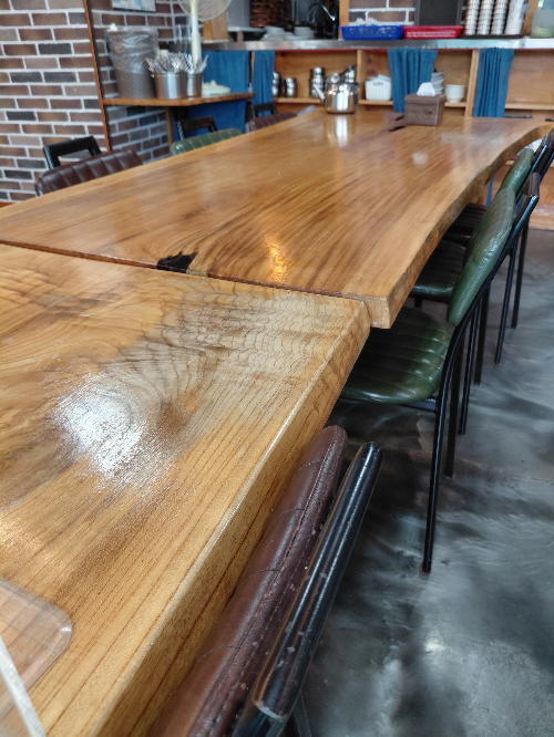식당 안은 대가 저수지를 바라다 볼 수 있도록 통유리로 되어 있어 '뷰 맛집'임을 증명하고 있었습니다. 테이블도 직접 디자인한 듯한 큼직한 원목으로 되어 있어 더욱 매력적이었어요.