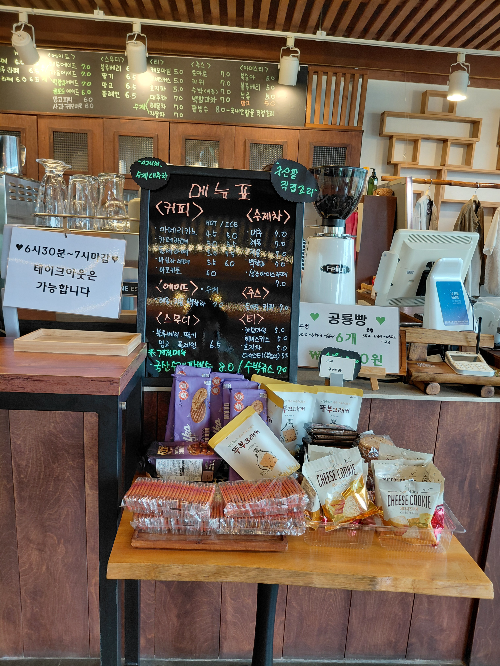 따뜻한 커피 한 잔을 마시며 창밖의 풍경을 보고 있자니, 복잡했던 생각들이 저절로 정리되는 기분이었죠. 특히 해 질 녘 노을이 저수지 수면에 비칠 때의 모습은 정말 장관이라고 하니 시간을 맞춰 방문해 보세요. 저희는 날씨가 흐려 못 봤습니다.