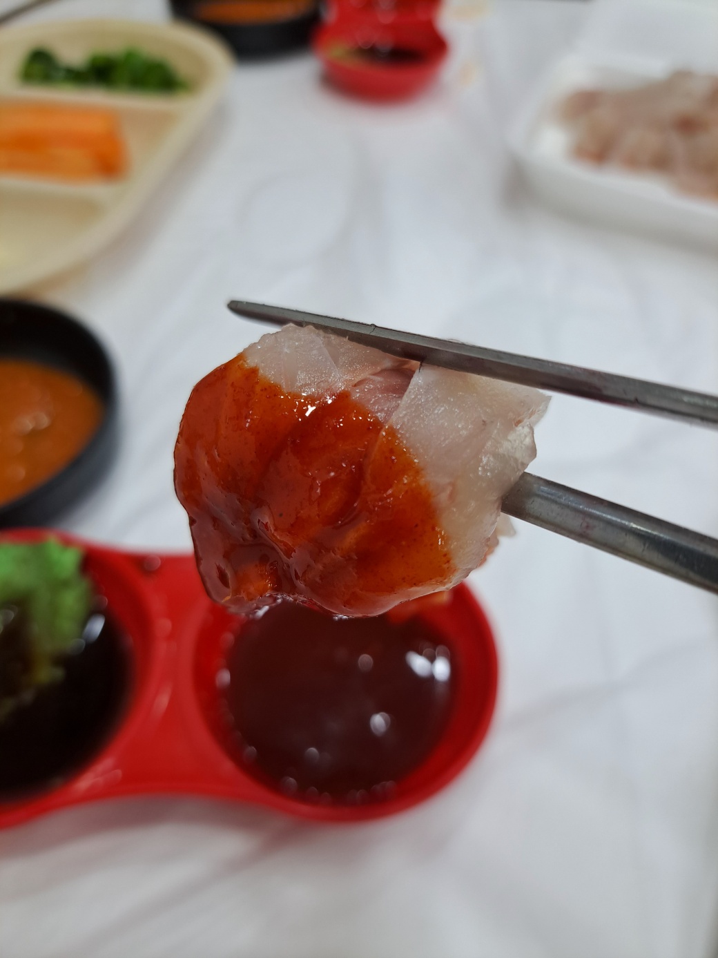 활어 상인들이 구매한 회를 다듬어주면 근처 초장 집에 가서 먹어요