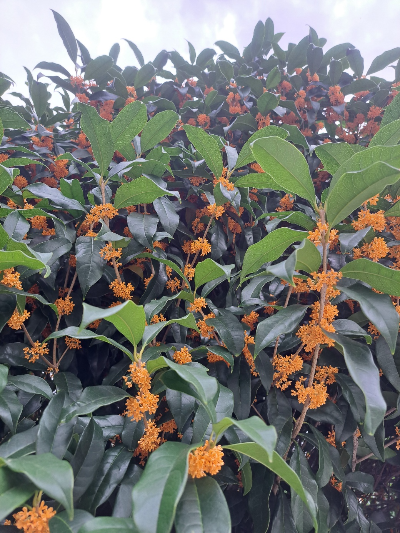 금목서는 늦여름에서 초가을 사이, 9월 말부터 10월 초에 아름다운 황금빛 꽃을 피우는 상록 관목입니다. 키가 5~10m까지 자라며, 잎은 두껍고 광택이 있어 언제나 신선해 보입니다. 꽃은 작고 다닥다닥 모여 피며 나무 전체가 황금빛으로 물든 듯한 화려한 풍경을 자아냅니다.