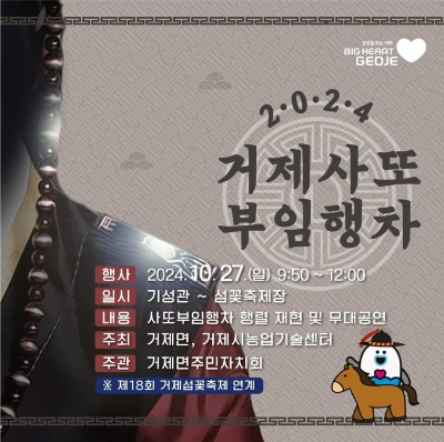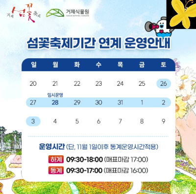 | ☆ 제18회 거제섬꽃축제 ☆ ○ 주제: 꽃을 찾아 떠나는 치유여행 ○ 슬로건: 꿈, 사랑, 환희 ● 축제기간: 10월 26일~11월 3일 ● 장소: 거제시농업개발원 일원 ● 주소: 경남 거제시 거제면 거제남서로 3577 ☎ 문의: 055-639-6441(거제시농업기술센터 농업관광과 도시농업팀) |