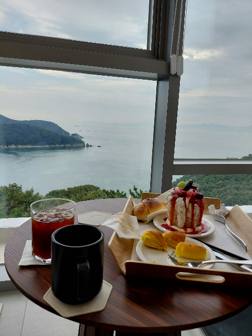 저희는 3층에 자리를 잡았습니다. 넓은 공간이었지만 겨우 자리를 마련해서 앉았습니다. 멀리 보이는 아름다운 바다 풍경과 어울어진 커피와 베이커리의 조화는 더할 나위 없는 행복감을 안겨줬습니다.
