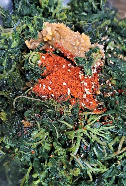 큰 볼에 물기를 짠 비름나물과 양념장 재료(고추장, 된장(멸치액젓: 취향에 따라), 참기름/들기름, 다진 마늘, 고춧가루, 매실액/올리고당, 통깨)를 모두 넣고, 손끝으로 살살 조물조물 무쳐주세요. (잘게 다진 대파를 조금 넣어주면 향긋함이 더 살아납니다.)