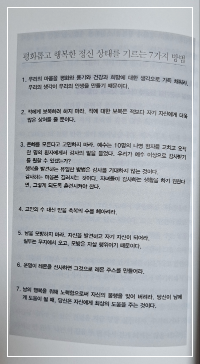 '카네기 행복론'의 내용 중에 '평화롭고 행복한 정신 상태를 기르는 7가지 방법'에 대한 내용이 나옵니다.