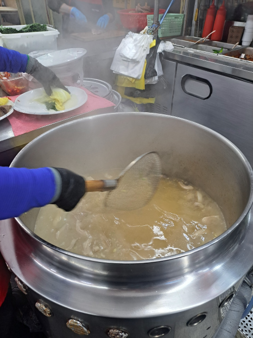 조금 있으니 들어오라고 신호를 줬어요. 자리에 앉아서 머리국밥과 순대국밥 중 우리는 돼지 머리 고기를 사용하여 만든 머리국밥을 주문했습니다. 머리국밥은 맑은 국물에 콩나물과 부추가 들어가 담백하고 시원한 맛이 일품이라고 합니다.
