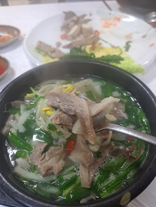 조금 있으니 들어오라고 신호를 줬어요. 자리에 앉아서 머리국밥과 순대국밥 중 우리는 돼지 머리 고기를 사용하여 만든 머리국밥을 주문했습니다. 머리국밥은 맑은 국물에 콩나물과 부추가 들어가 담백하고 시원한 맛이 일품이라고 합니다.