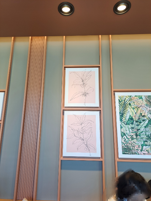 2층에 올라가면 역 'ㄷ'자 모양의 공간이 되어 있고 편안한 좌석들이 많이 준비되어 있었어요. 스타벅스 커피점의 매력은 대화하기 편하다는 것이라고 생각하는데 이곳도 편했어요. 그리고 벽에는 멋진 액자 그림들이 손님들을 반겨주고 있어 갤러리에 온 듯합니다.