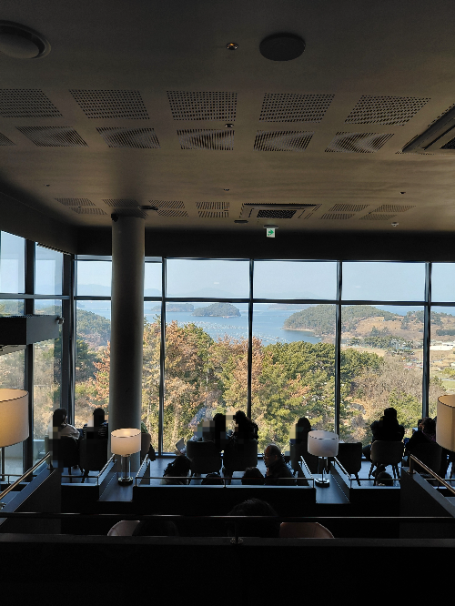 2층은 파노라마 오션뷰의 정수로 계단을 올라가는 순간 펼쳐지는 180도 바다 전망이 최고였습니다. 좌석 배치 또한 바다를 향해 계단식이나 창가 집중형으로 구성되어 있어, 어느 자리에 앉아도 '뷰멍'이 가능했어요.