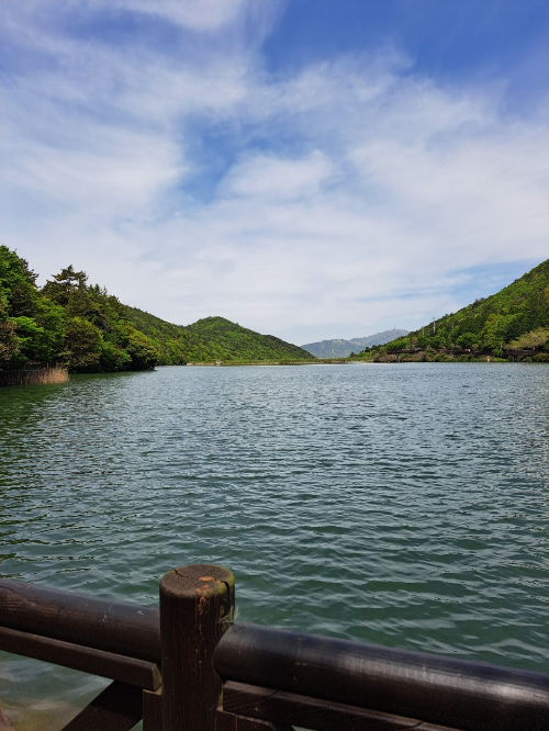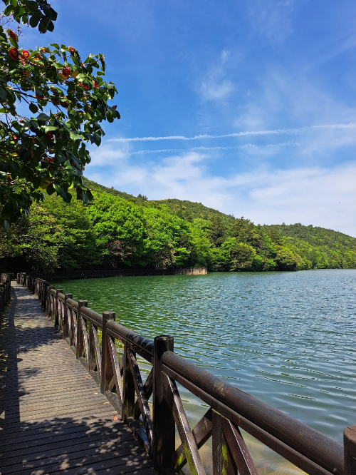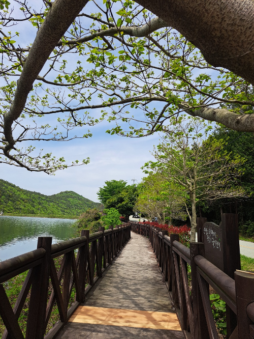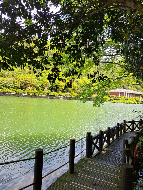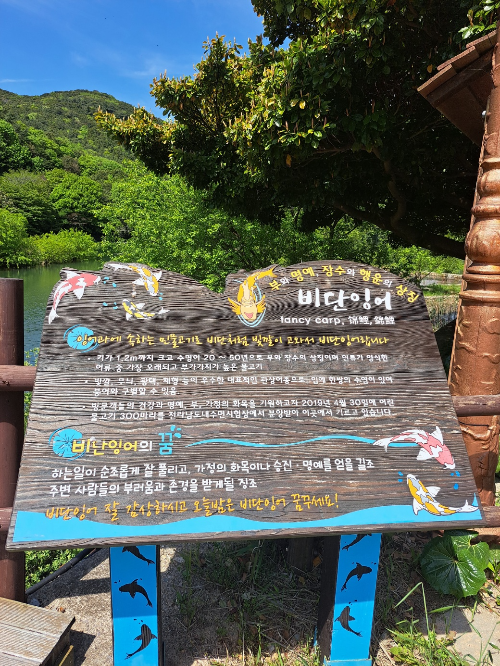 특히, 수목원 안에 자리한 작은 호수는 완도수목원의 빼놓을 수 없는 매력인 것 같습니다. 잔잔한 수면 위로 비치는 푸른 하늘과 울창한 나무들의 반영은 그 자체로 한 폭의 그림 같아요. 그리고 이 호수에는 정말 아름다운 비단잉어들이 살고 있습니다! 주황색, 흰색, 검은색 등 고운 색을 입은 비단잉어들이 유유히 헤엄치는 모습을 보고 있으면 마음이 절로 평온해집니다. 먹이가 없어 안타까웠어요.