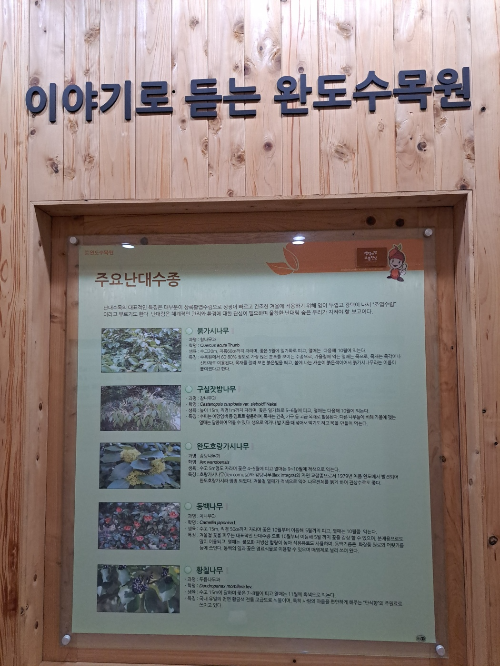 완도 수목원에는 붉가시나무, 황칠나무, 후박나무, 감탕나무, 굴거리나무, 구실잣밤나무, 동백나무 등 다양한 난대수종과 야생 동식물을 만날 수 있는 특별한 곳입니다.
