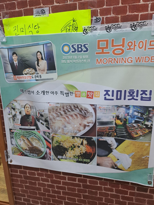 완도 여행을 하고 맛집을 찾다가 완도를 한눈에 볼 수 있는 곳, 바로 시장이 아닐까 싶어 찾아갔으나 그날은 시장 쉬는 날이었어요. 두서너 분이 시장을 지키고 있길래 전복 맛있게 질 하는 집이 이 근처에 있을까요? 하고 물었더니 중앙시장 안 진미횟집을 소개해주셨습니다. 막상 들어가 보니 식객 허영만의 백반 기행과 SBS 모닝와이드, 6시 내 고향에 나온 맛집이었습니다.