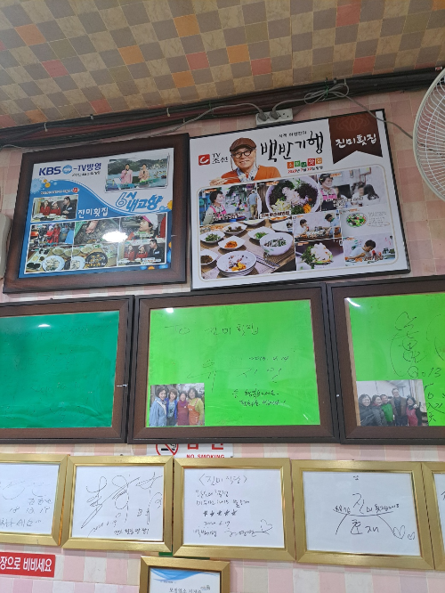 완도 여행을 하고 맛집을 찾다가 완도를 한눈에 볼 수 있는 곳, 바로 시장이 아닐까 싶어 찾아갔으나 그날은 시장 쉬는 날이었어요. 두서너 분이 시장을 지키고 있길래 전복 맛있게 질 하는 집이 이 근처에 있을까요? 하고 물었더니 중앙시장 안 진미횟집을 소개해주셨습니다. 막상 들어가 보니 식객 허영만의 백반 기행과 SBS 모닝와이드, 6시 내 고향에 나온 맛집이었습니다.