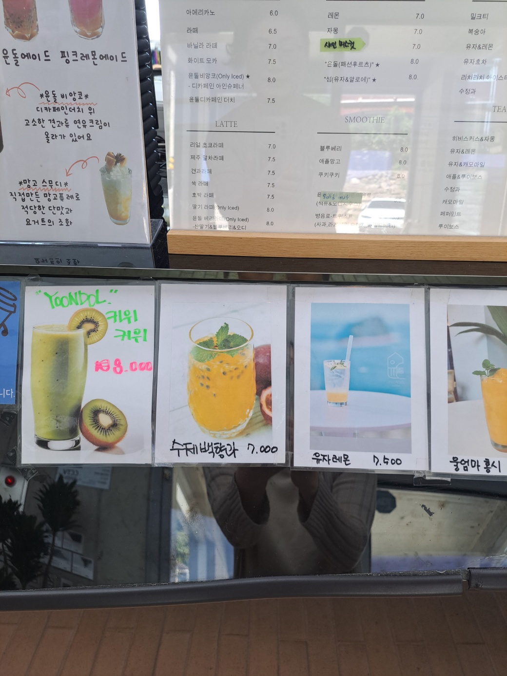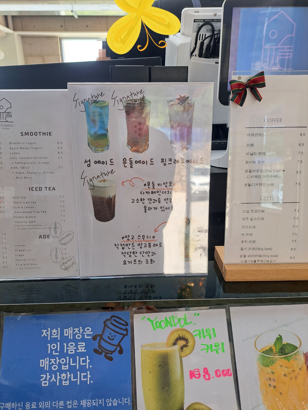 윤돌커피는 커피 맛도 일품이에요. 창밖 바다뷰를 감상하며 마시는 커피는 마음을 치유한다고 할까요? 멍 때리기에도 좋아요. 또 사장님이 개발한 다양한 메뉴들이 눈과 입을 유혹합니다.