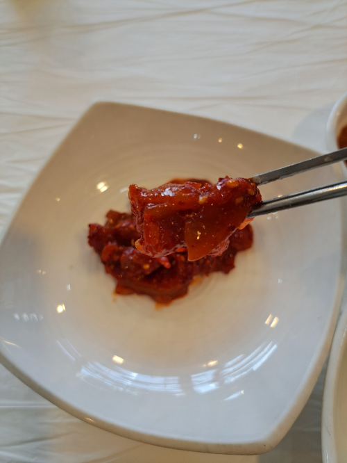 반찬으로는 시금치, 배추김치, 깍두기, 오징어젓갈, 청량초, 양파, 쌈장이 나왔는데 하얀 접시에 담겨 있어 더욱 깔끔했습니다.