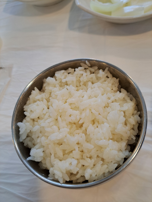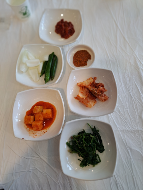 반찬으로는 시금치, 배추김치, 깍두기, 오징어젓갈, 청량초, 양파, 쌈장이 나왔는데 하얀 접시에 담겨 있어 더욱 깔끔했습니다.