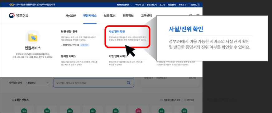 사실/진위 확인 서비스는 정부24 회원가입 및 로그인을 하지 않아도 이용하실 수 있습니다.