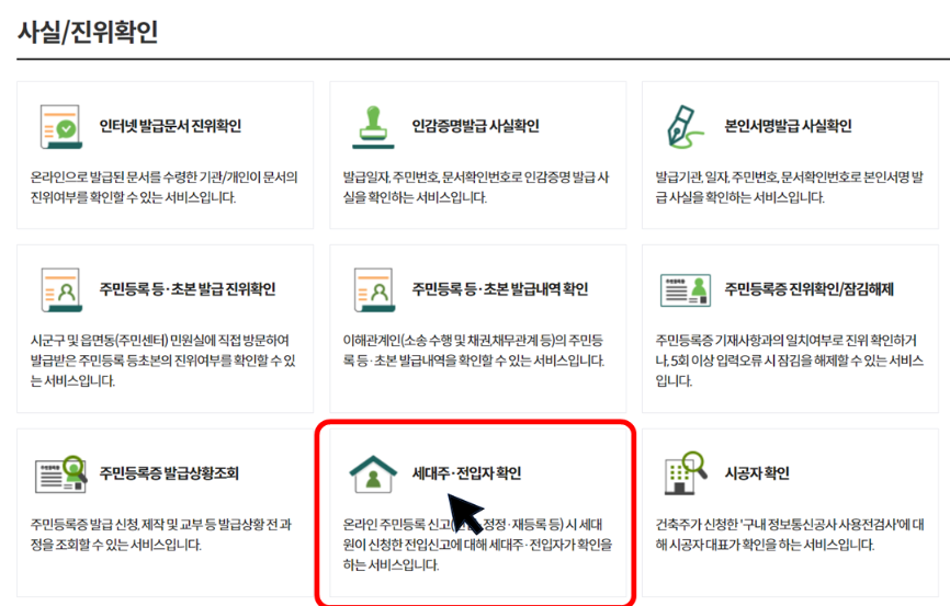 '세대주 · 전입자 확인' 메뉴를 클릭합니다.