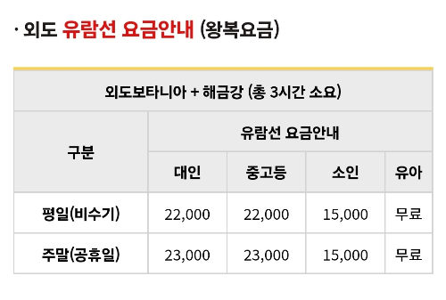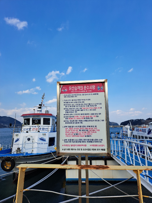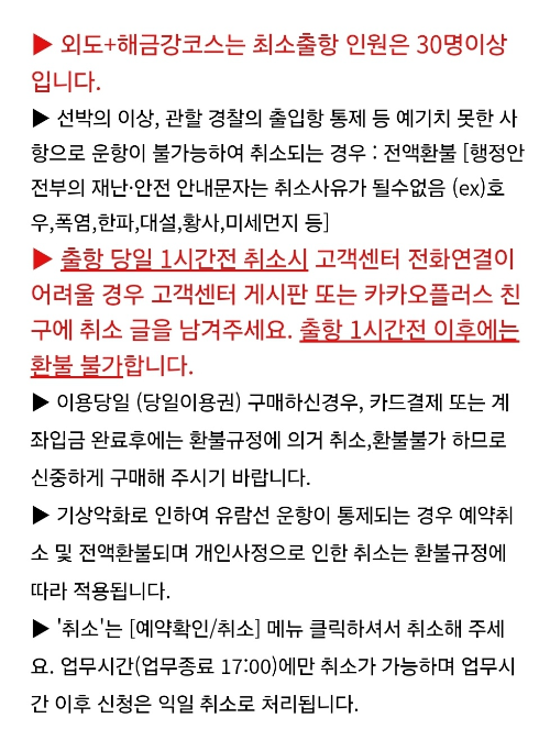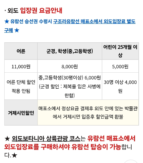 승선 당일 해상의 파도, 안개, 바람 등의 기상상황, 외도에 승선, 하선시 시간지연 등으로 다소 출항시간이 10~30분 조기 또는 지연 출발할 수 있다고 합니다. 유람선 매표소에 꼭 30분 전에 도착하셔야 합니다.