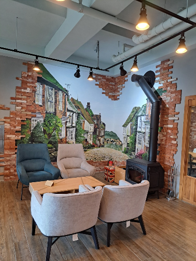또 한쪽 벽면을 멋지게 꾸며 놓은 그림과 난로는 레스토랑을 더 따뜻하고 아늑하게 보이게 했어요.