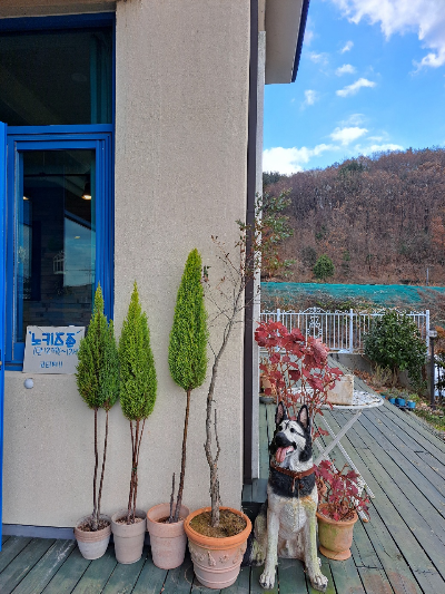 코티지 11 레스토랑 입구에 들어서면 율마 화분과 파란 문이 듬직하게 있어요. 지금은 겨울이라 문이 닫혀 있지만 날씨가 따뜻하면 늘 열려 있겠죠.