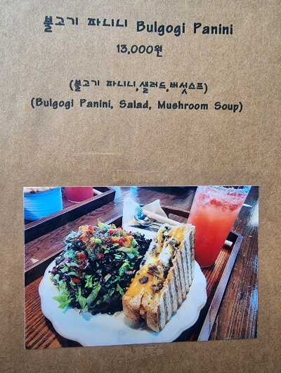 우리는 불고기 파니니, 아보카도 플레이트, 영국식 미트파이를 주문했어요.