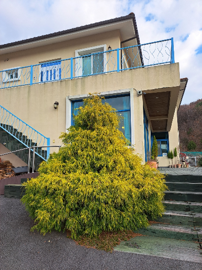 코티지 11 레스토랑 입구에 들어서면 율마 화분과 파란 문이 듬직하게 있어요. 지금은 겨울이라 문이 닫혀 있지만 날씨가 따뜻하면 늘 열려 있겠죠.