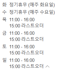 last order는 15:00까지이며, 매주 화요일, 수요일은 휴무입니다.