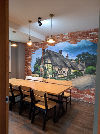 또 한쪽 벽면을 멋지게 꾸며 놓은 그림과 난로는 레스토랑을 더 따뜻하고 아늑하게 보이게 했어요.
