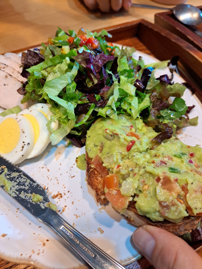 우리는 불고기 파니니, 아보카도 플레이트, 영국식 미트파이를 주문했어요.