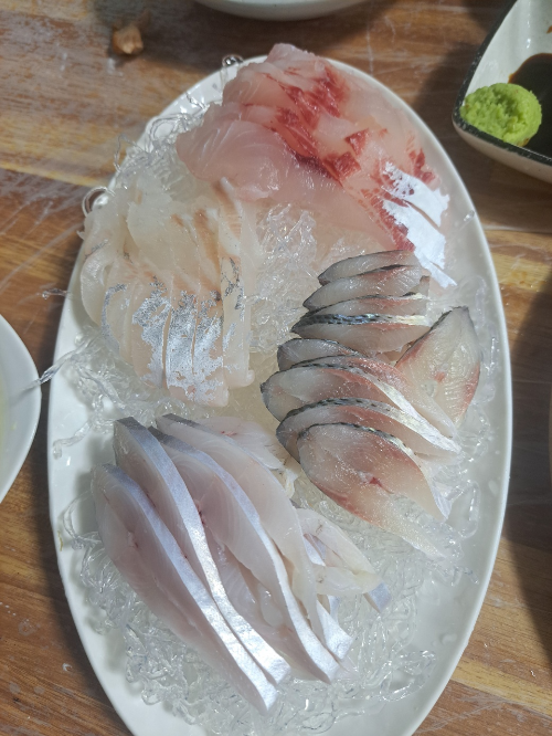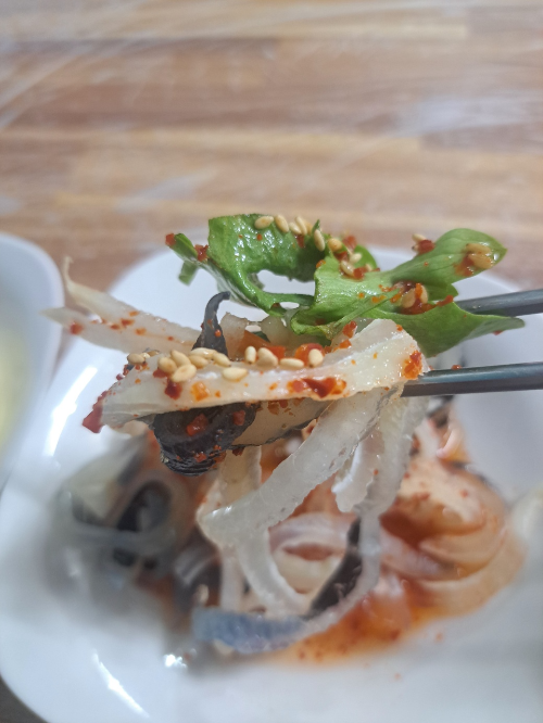 정말 먹고 또 먹고 있는데 이번에는 멸치회무침과 뱅어, 전어, 밀치 등으로 차린 싱싱한 회가 나왔어요.