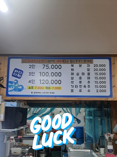 다찌 상차림의 가격은 2인 기준 75,000원으로 되어 있으며, 소주 한 병당 7,000원, 두 병은 기본이라고 했습니다. 그럼 2인이면 최소 89,000원의 비용은 든다고 보시면 됩니다.