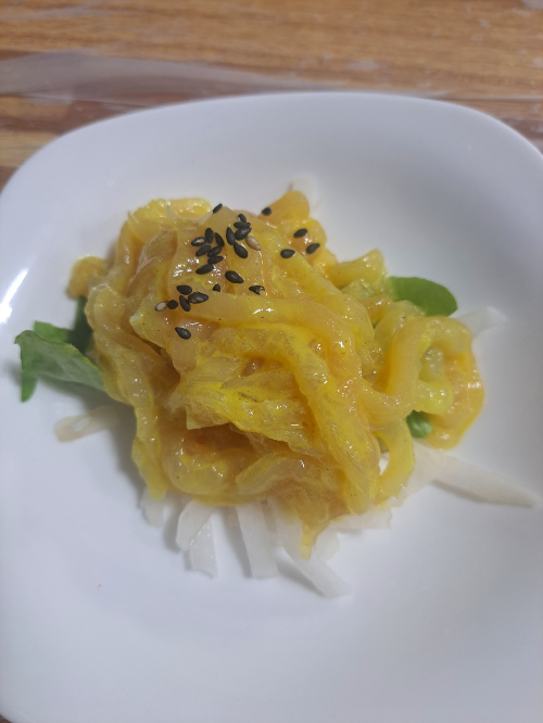 배가 가득이라고 생각할 쯤에 또 나왔습니다. 은행볶음과 건강에 좋은 하얀 마, 그다음에 특별 서비스 메뉴인 해삼내장(고노와다)이 나왔습니다. 건강을 마지막으로 챙기라는 뜻이 아닐까 하는 해석을 합니다.