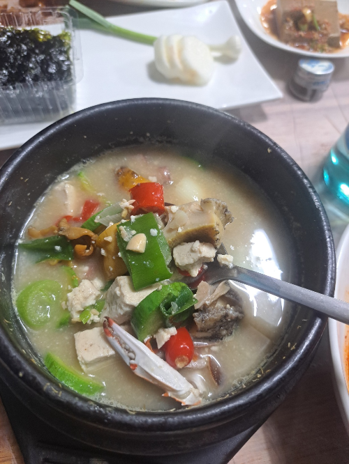마지막으로 해물된장뚝배기가 나왔습니다. 정말 해산물이 한가득 들어가 있어 바다를 정말 옮겨 놓은 건 아닐까 할 정도로 바다향기가 가득했습니다. 배가 정말 불렀는데 이 해물된장뚝배기에 들어 있는 된장국 매력에 푹 빠져서 아주 맛있게 먹었습니다.