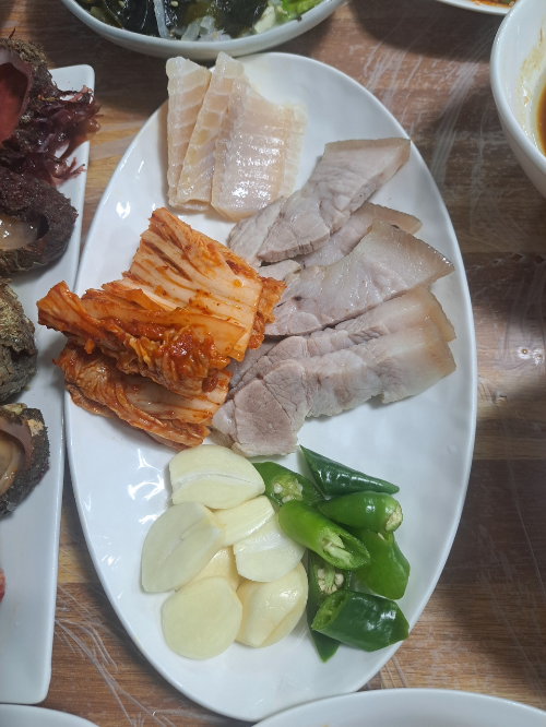열심히 먹고 있는데 메인메뉴 해산물 모둠과 삼겹살, 홍어, 김치 삼합이 나왔습니다. 일반해삼, 홍삼, 전복, 개불, 문어, 소라, 멍게, 군소로 차린 아주 싱싱한 해산물 모둠,