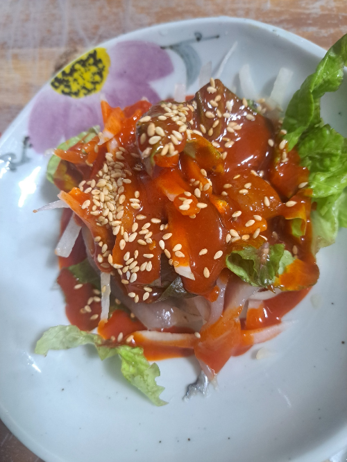 정말 먹고 또 먹고 있는데 이번에는 멸치회무침과 뱅어, 전어, 밀치 등으로 차린 싱싱한 회가 나왔어요.