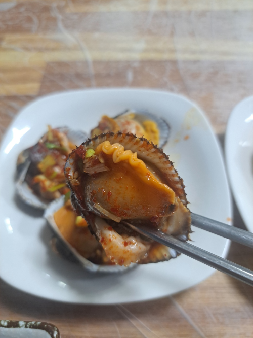 아니나 다를까 다음으로 자연산 돌멍게, 가리비찜, 가오리 양념찜이 나와서 눈과 입을 즐겁게 해 줬습니다.해산물들이 신선해서 아주 만족스러웠습니다.